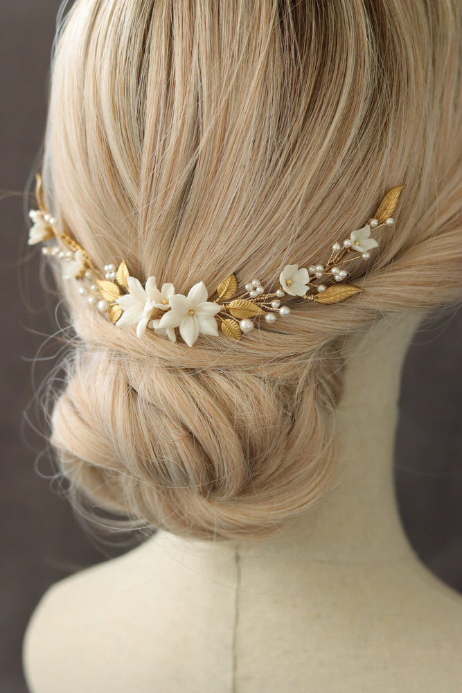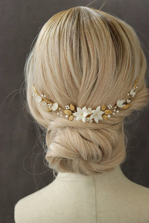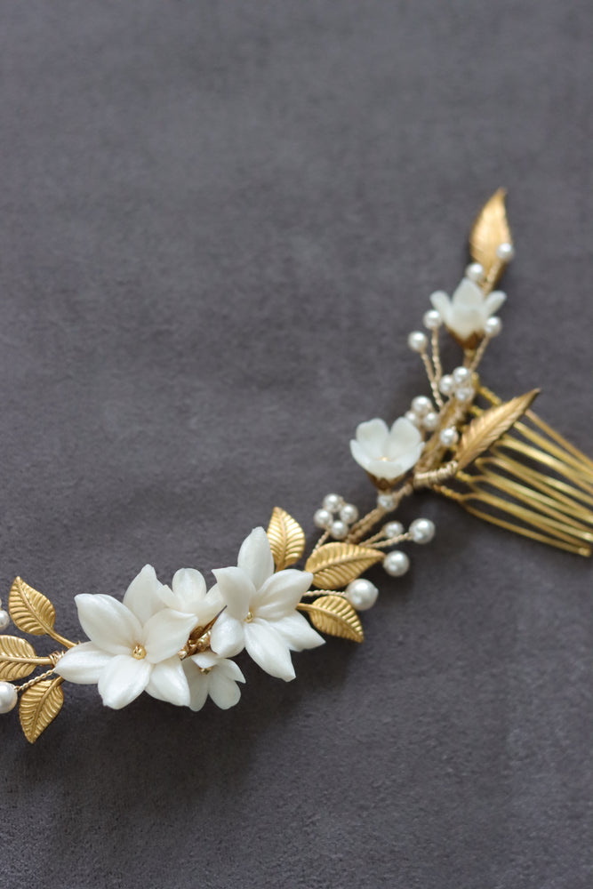 Artfully designed with mirrored details from one side to the other, the Elodie hair comb was designed for a French bride getting married in the champêtre countryside. A sophisticated piece that's barely there but noticeable at the same time, the Elodie features a beautiful cluster of flowers in its centre. Little flowers and leaves then make their way onto the vine to gradually blend seamlessly into the hair.