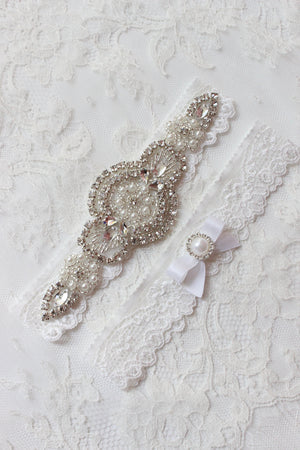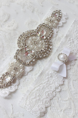 ALICE | White Lace Wedding Garter Set with Crystals and Pearls - Classic Wedding Garter
