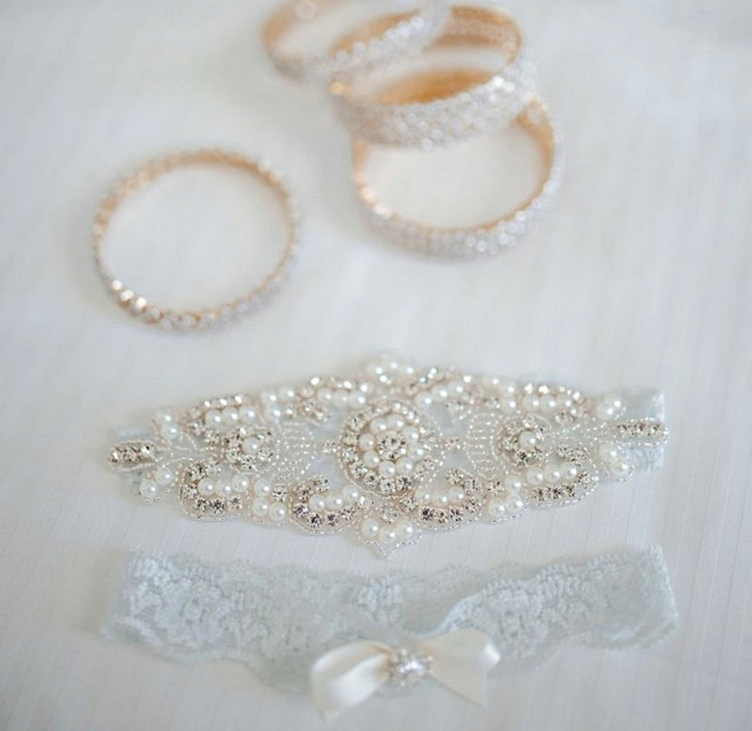 Oh, we love this soft blue colour! Made of exquisite dusty blue lace, this set of garters is simply gorgeous and is perfect for the romantic-minded bride seeking to add a touch of sparkle to her wedding day and combine it with the traditional something blue that will bring her luck. We like to recommend this garter design to xsmall-small size brides.