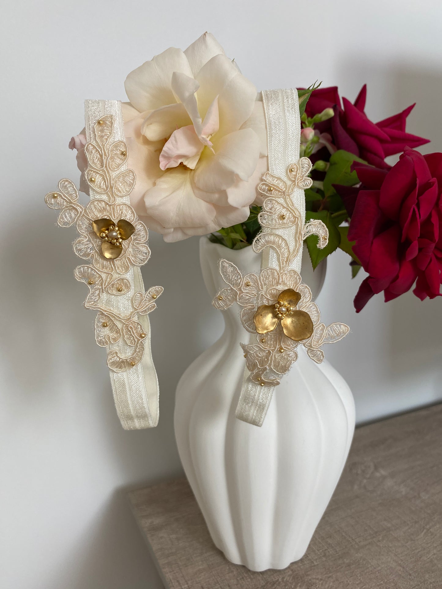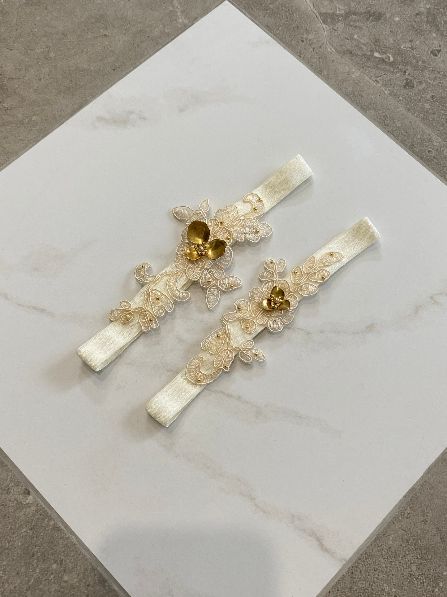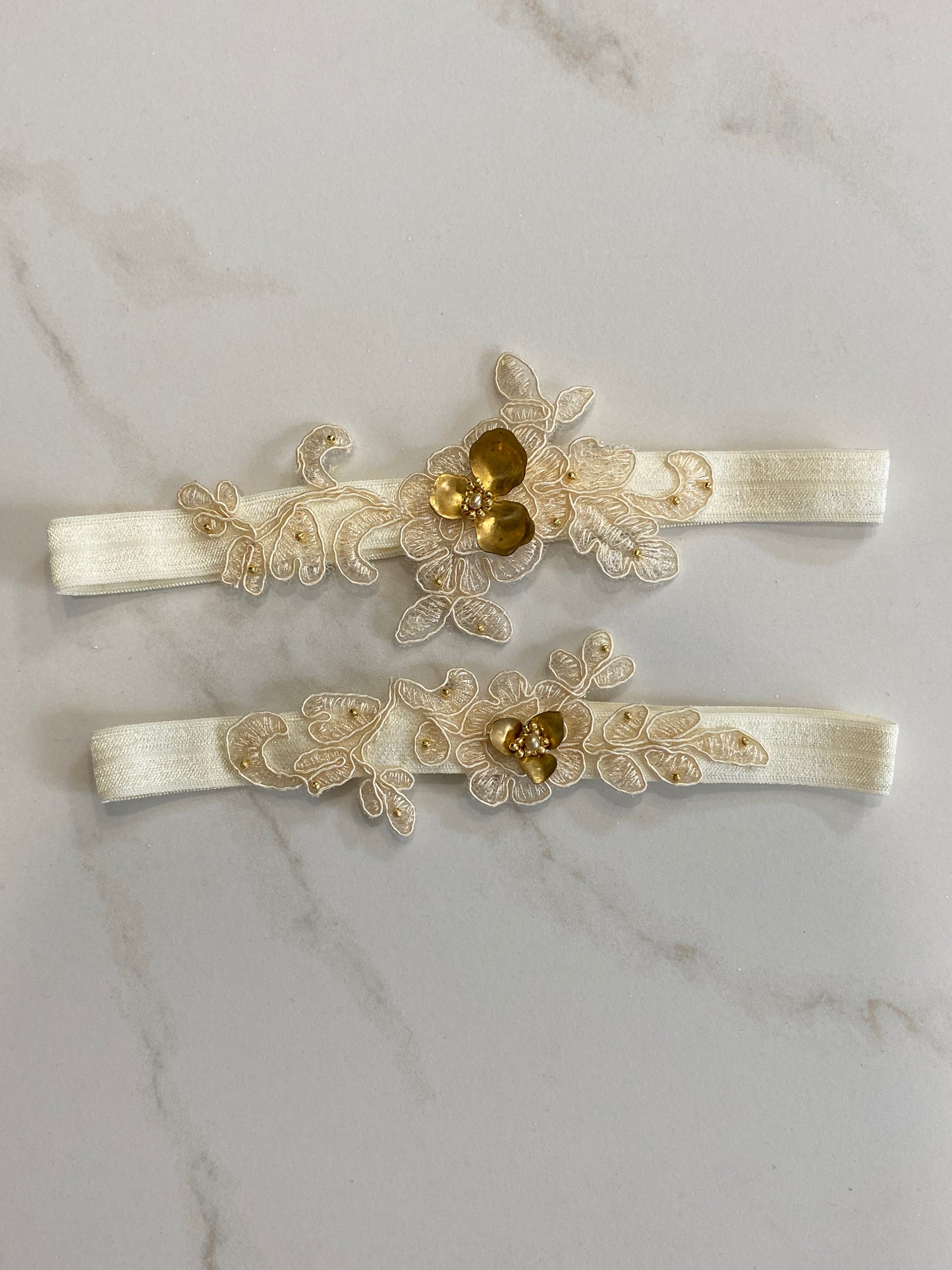 If you love the idea of owning a one-of-a-kind garter set, this is your chance! Every lace flower and leaf are hand-cut and meticulously hand-sewn in place to create this beautiful pattern. It is then embellished with hand-sewn golden natural pearls and golden seed beads along with gorgeous brass orchide petals. To make this design comfortable, we chose a beautiful elasticated satin ribbon.