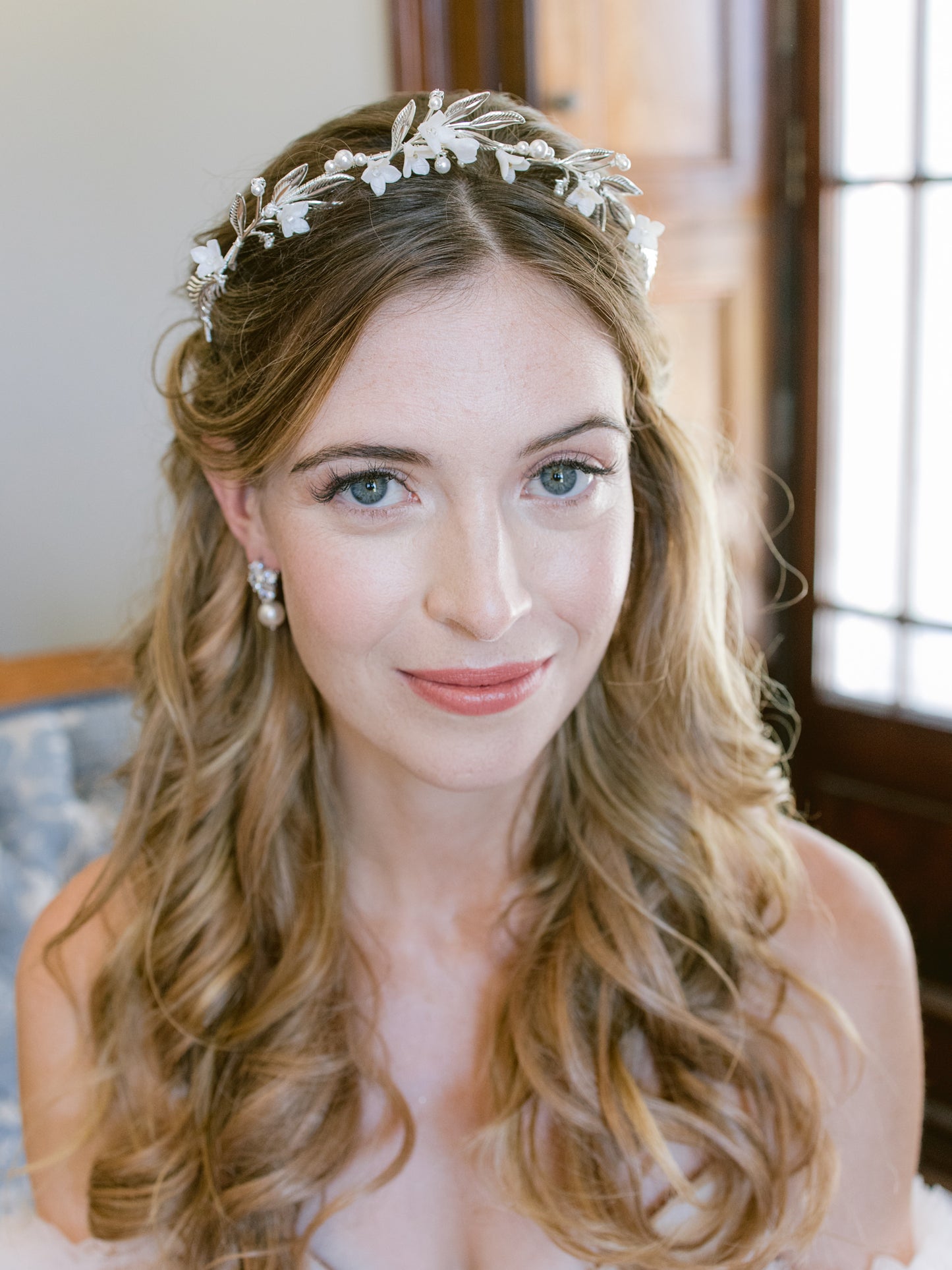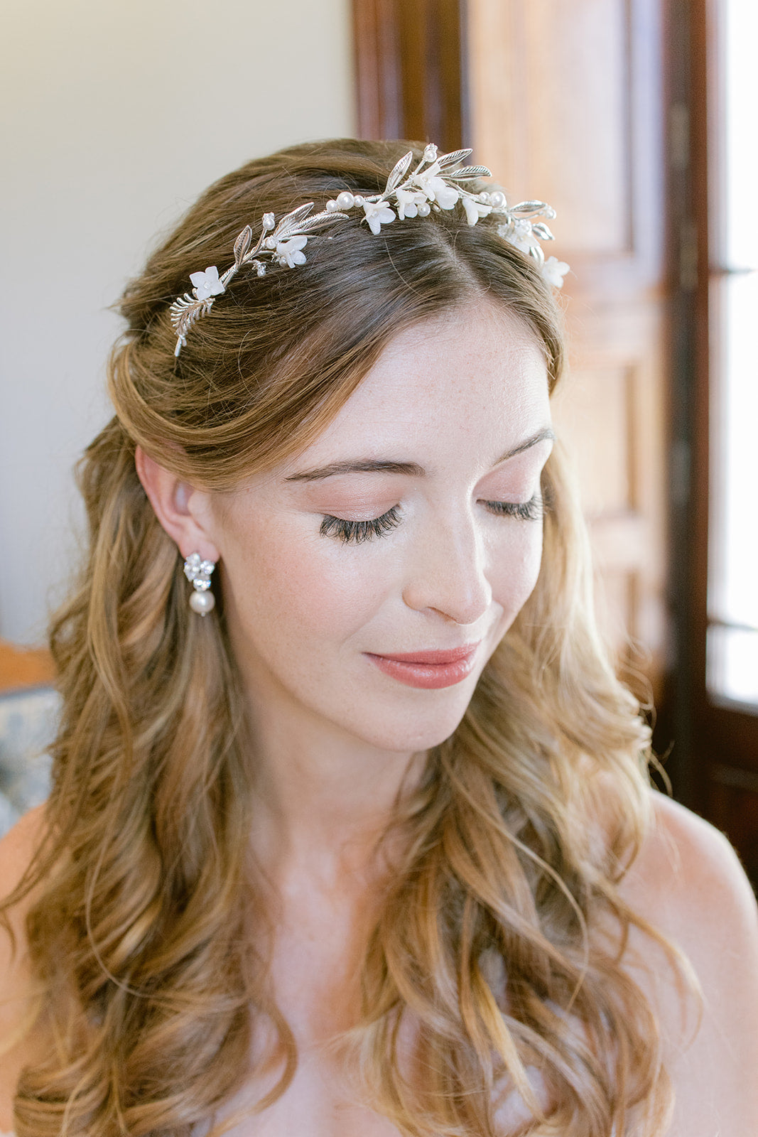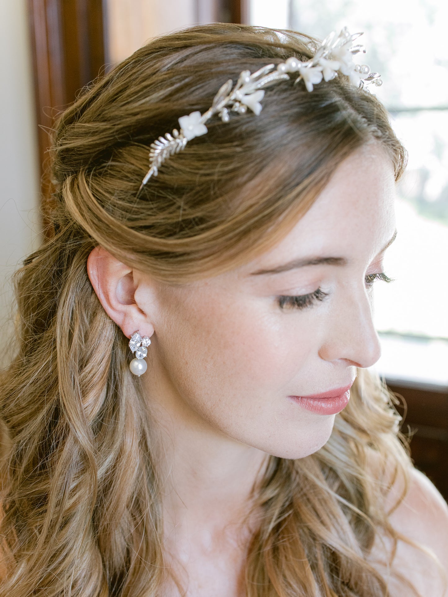 The Spencer silver leaf tiara was designed for the minimalist-opulent bride with modern vintage styling in mind. Featuring a clean aesthetic made of silver foliages and crystalised pearls, growing flowers take this tiara to the next level. Wear it with a veil and white feminine dress or make it look more romantic with an ethereal dress and classic pearl earrings.