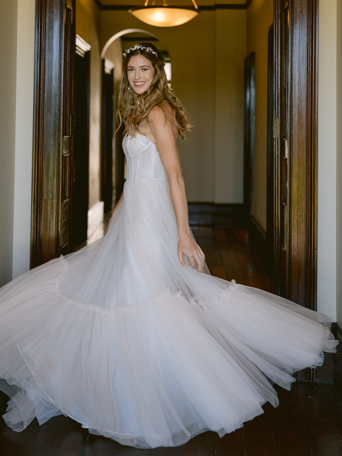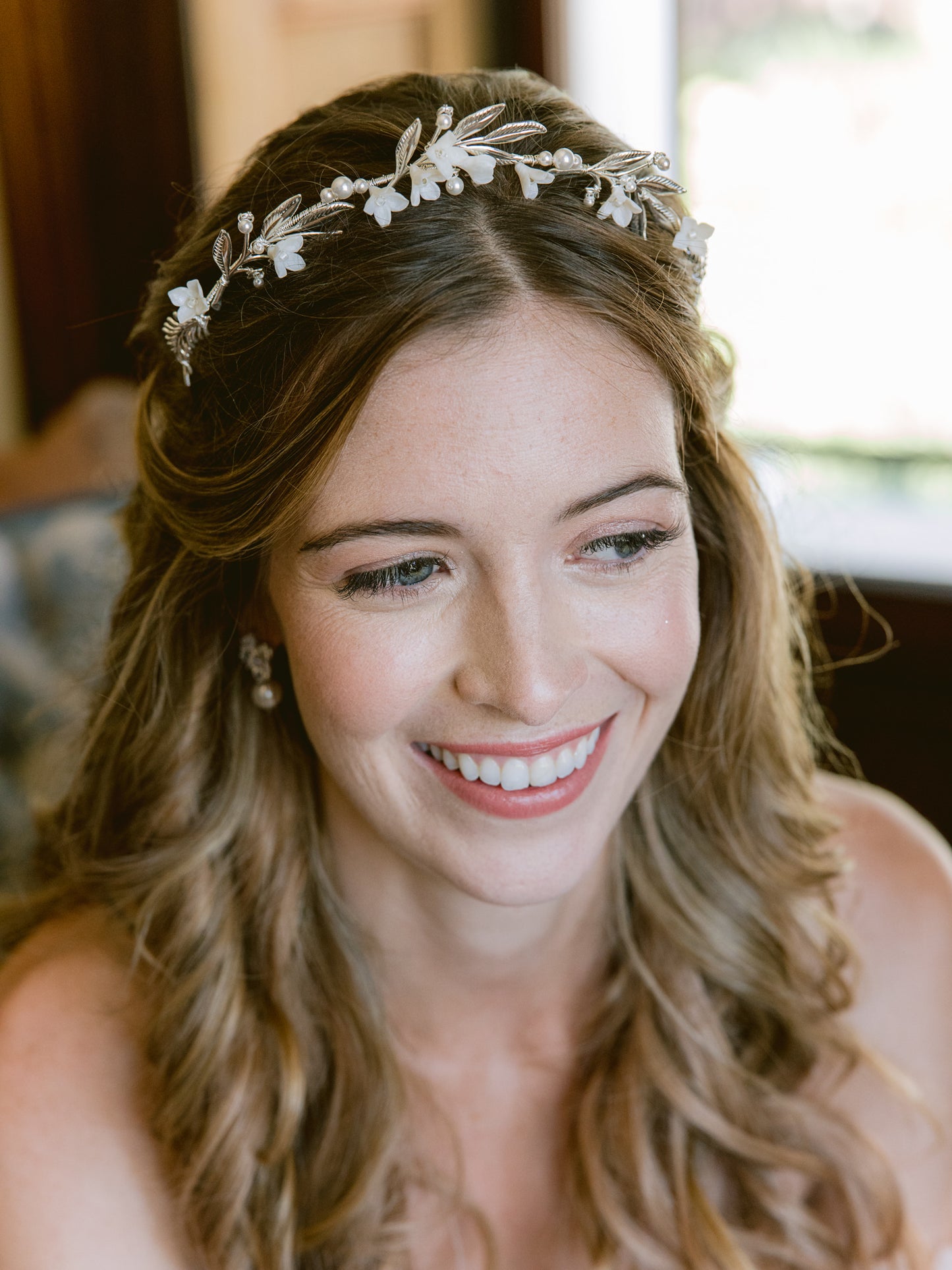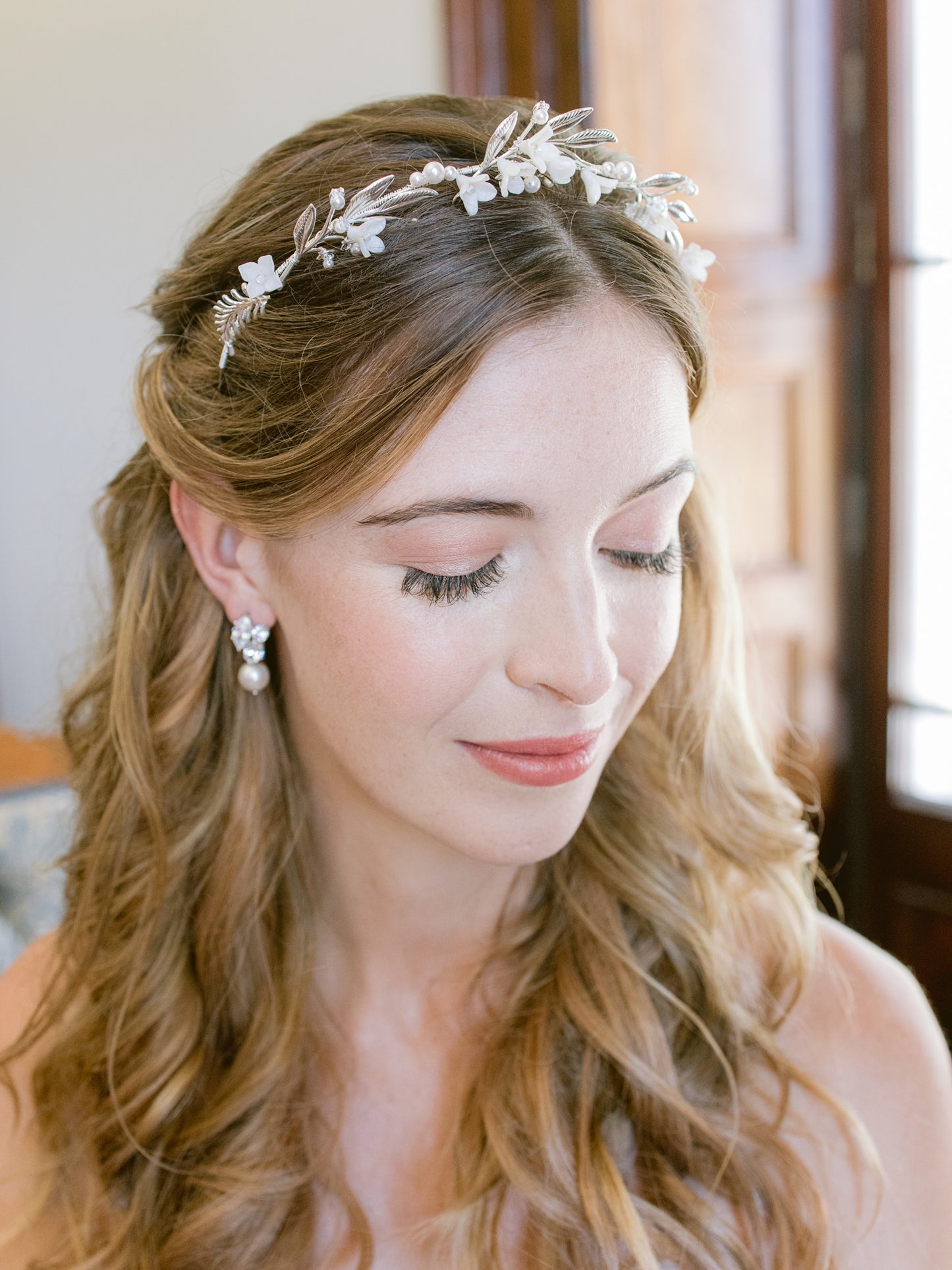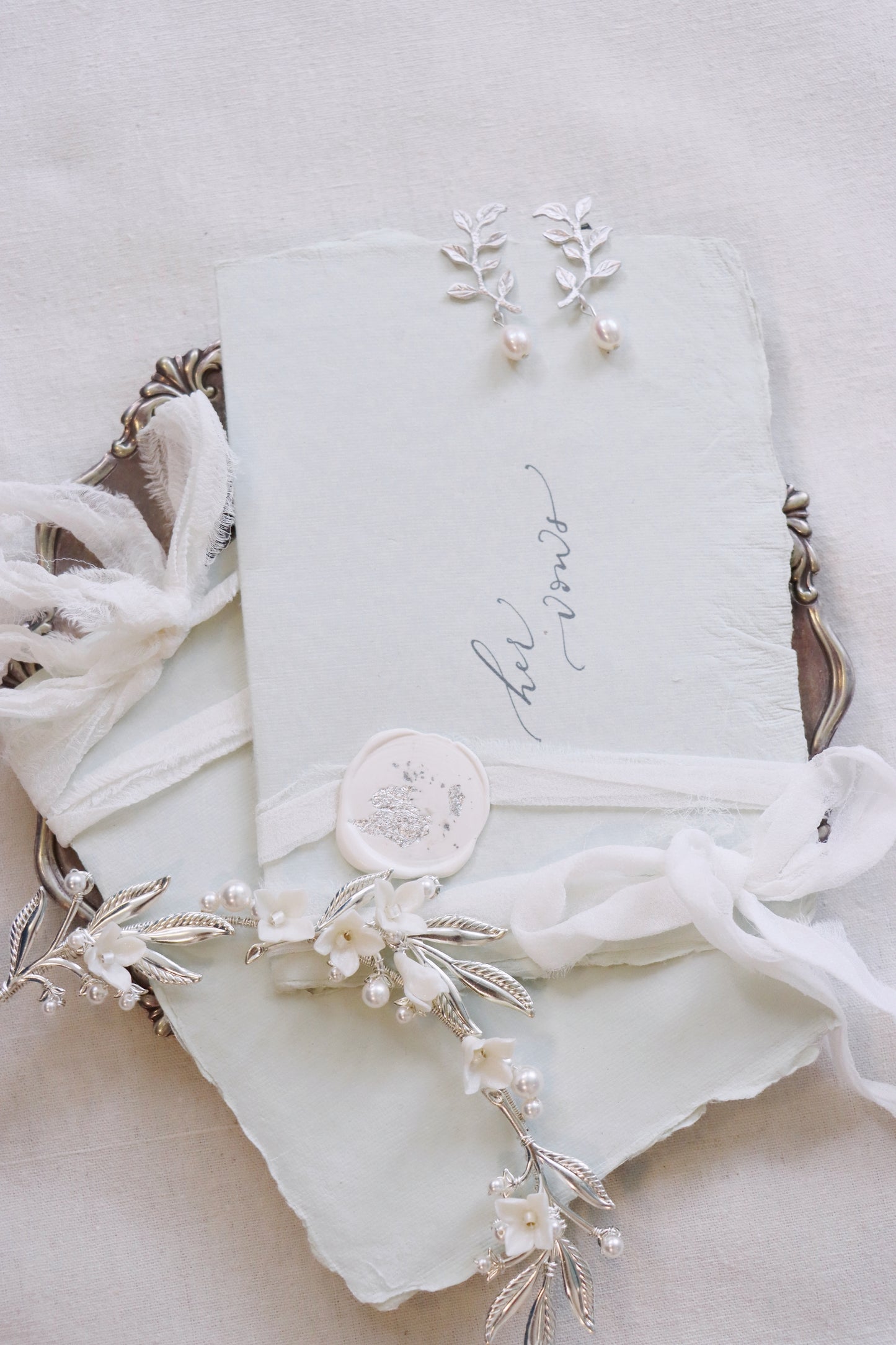 The Spencer silver leaf tiara was designed for the minimalist-opulent bride with modern vintage styling in mind. Featuring a clean aesthetic made of silver foliages and crystalised pearls, growing flowers take this tiara to the next level. Wear it with a veil and white feminine dress or make it look more romantic with an ethereal dress and classic pearl earrings.
