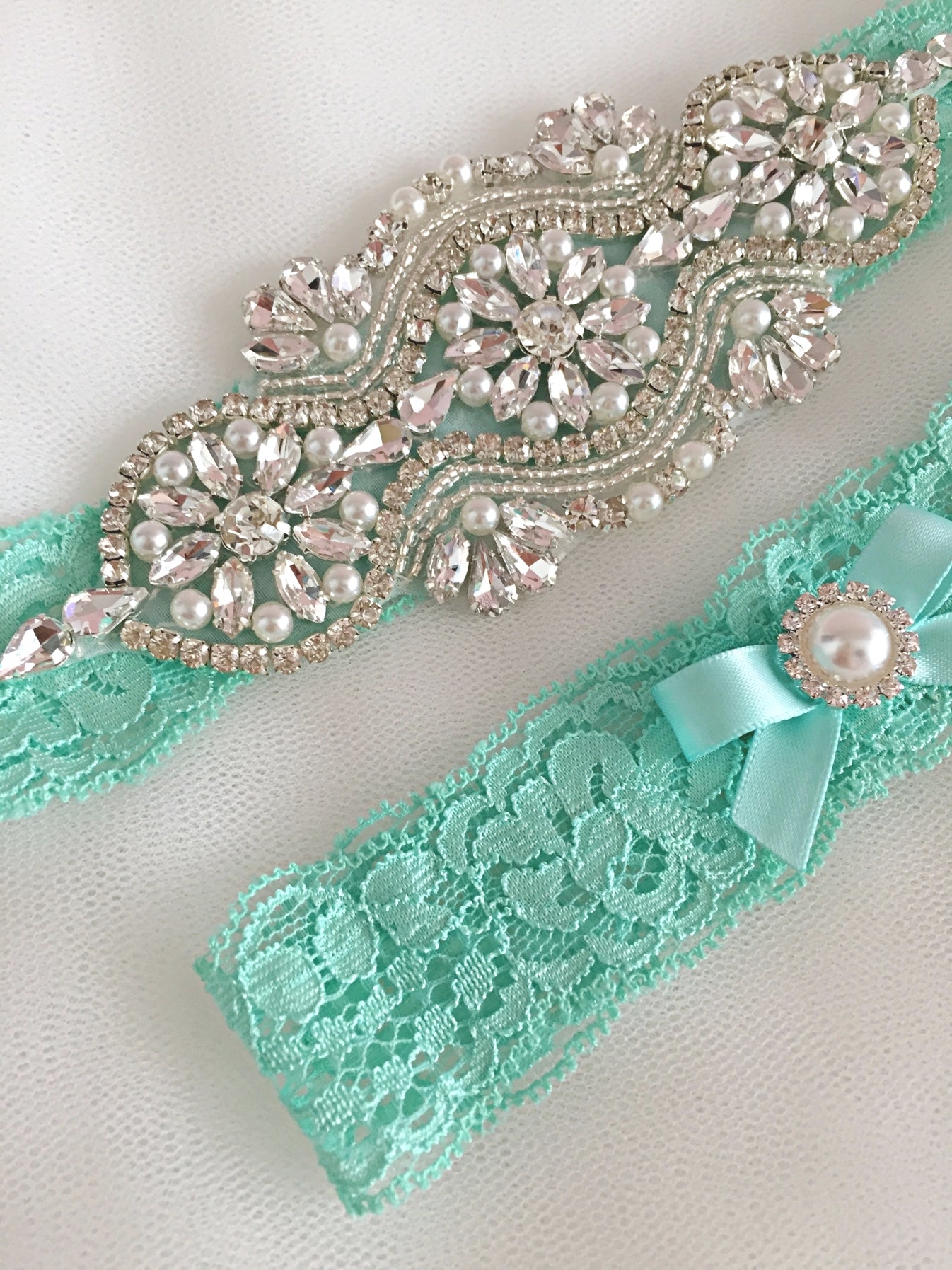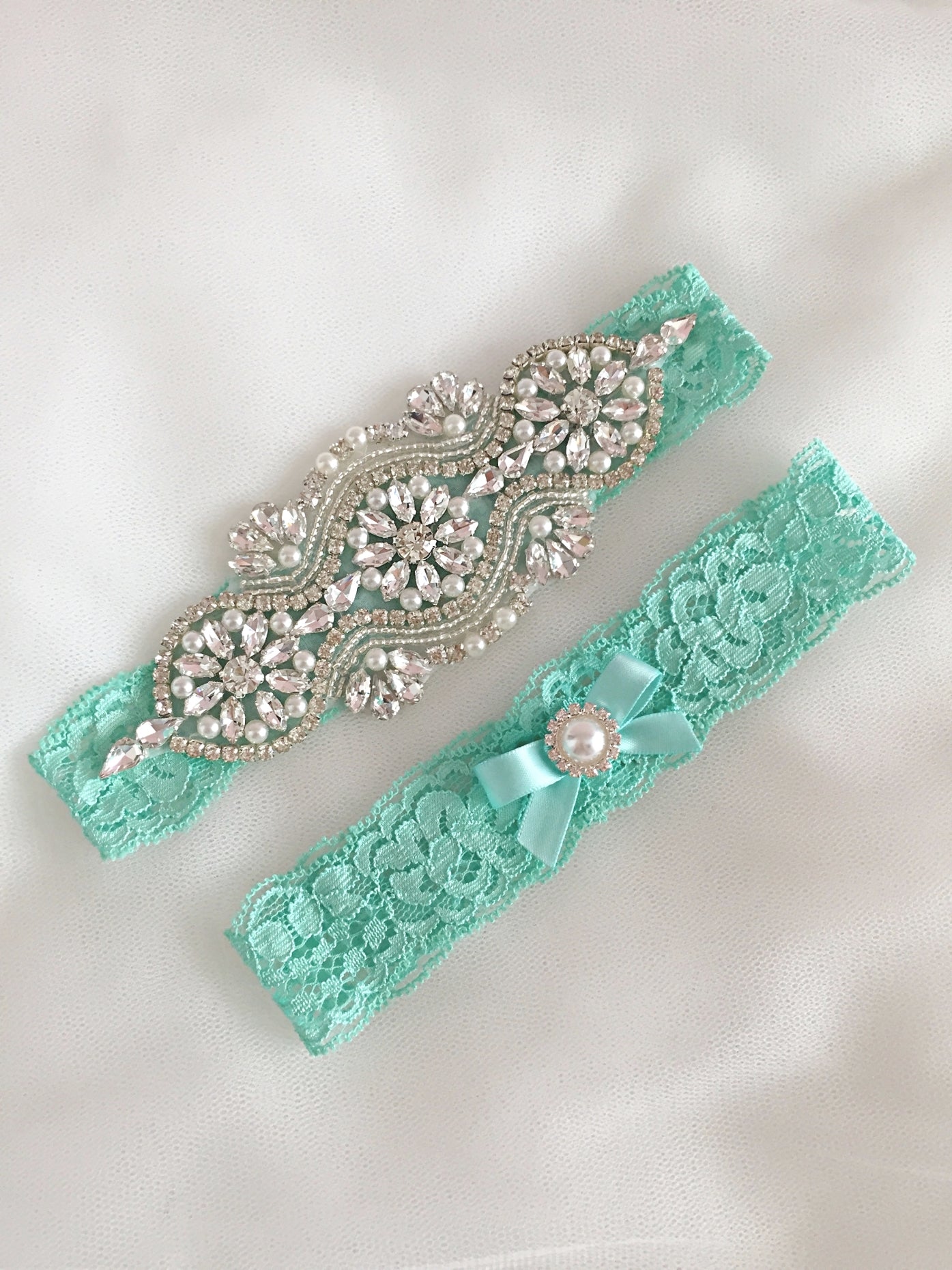 LEILA | Seafoam Turquoise Lace Wedding Garter Set with Crystals and Pearls