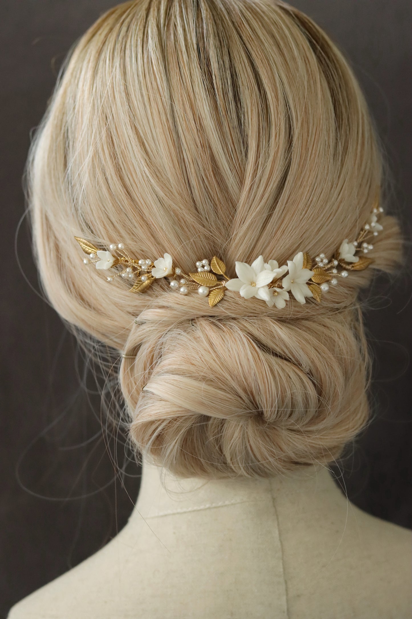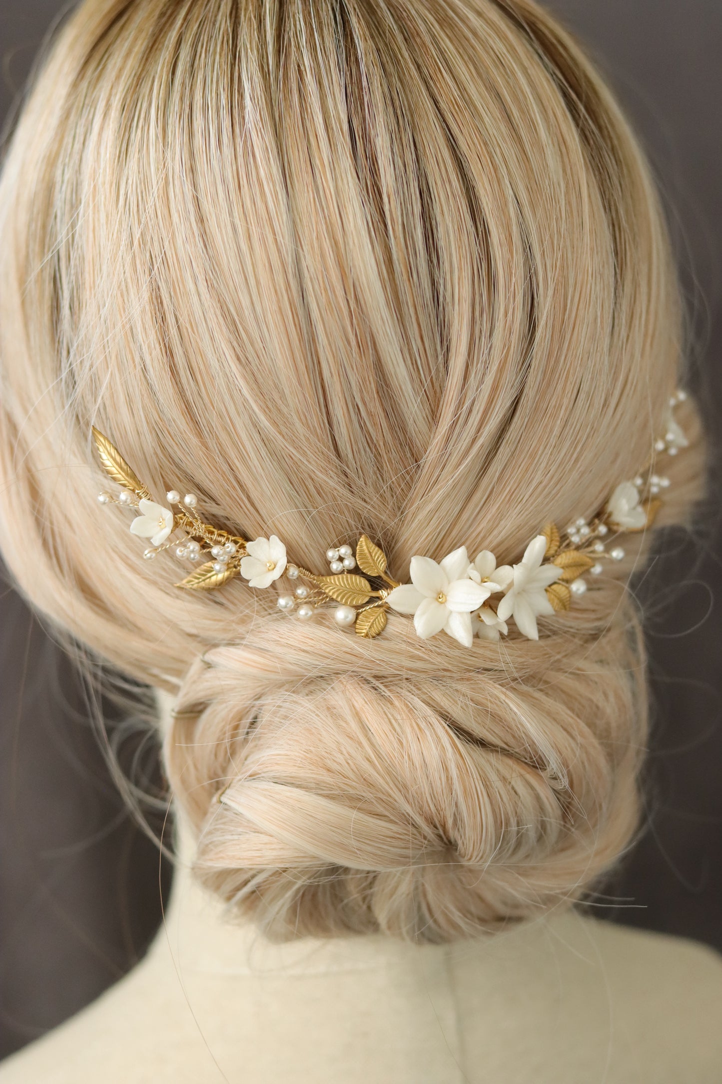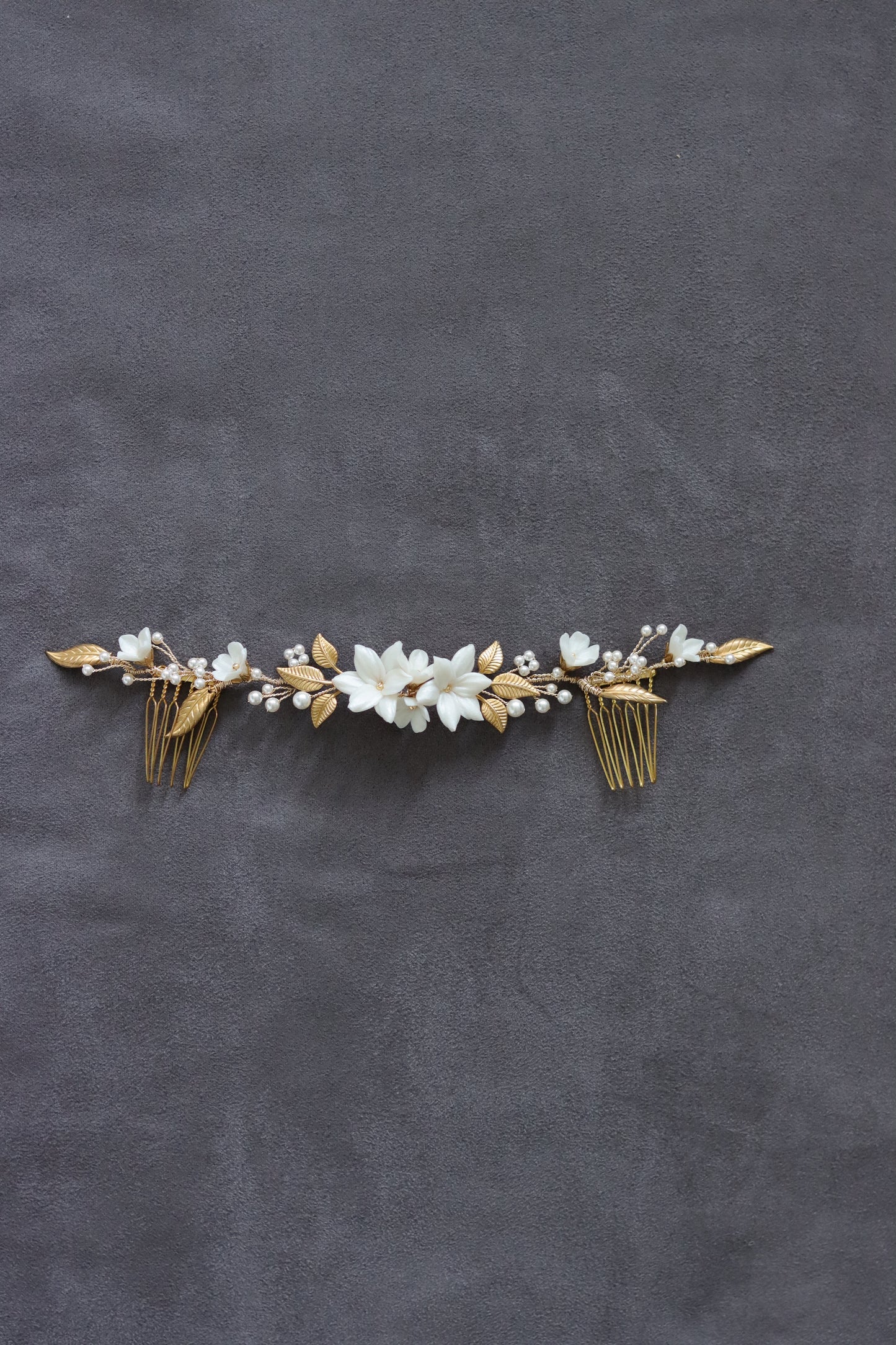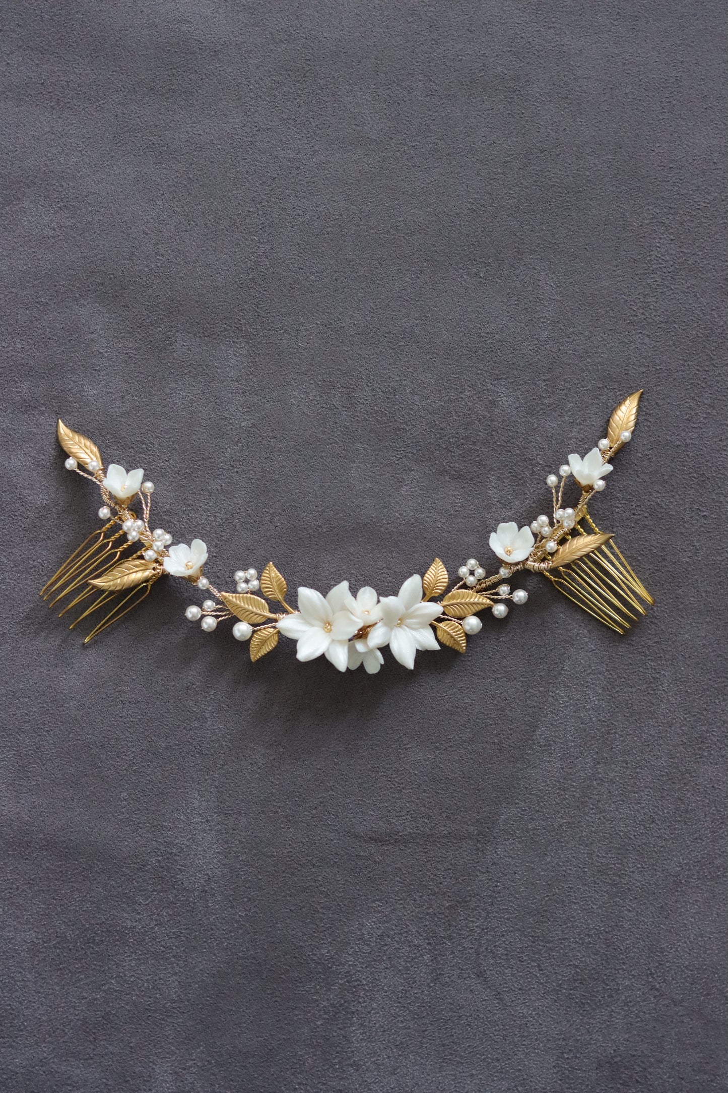 Artfully designed with mirrored details from one side to the other, the Elodie hair comb was designed for a French bride getting married in the champêtre countryside. A sophisticated piece that's barely there but noticeable at the same time, the Elodie features a beautiful cluster of flowers in its centre. Little flowers and leaves then make their way onto the vine to gradually blend seamlessly into the hair.
