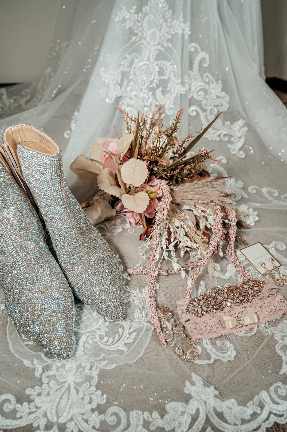 This wedding garter set is just oh dreamy and sophisticated! It features a beautiful dusty pink scalloped lace adorned with crystal and pearls in rose gold tones. Sparkling and bold, it will be the perfect addition to the chic bride seeking to add a romantic touch and glamour to her bridal lingerie. We like to recommend this garter set to xsmall-medium size brides.