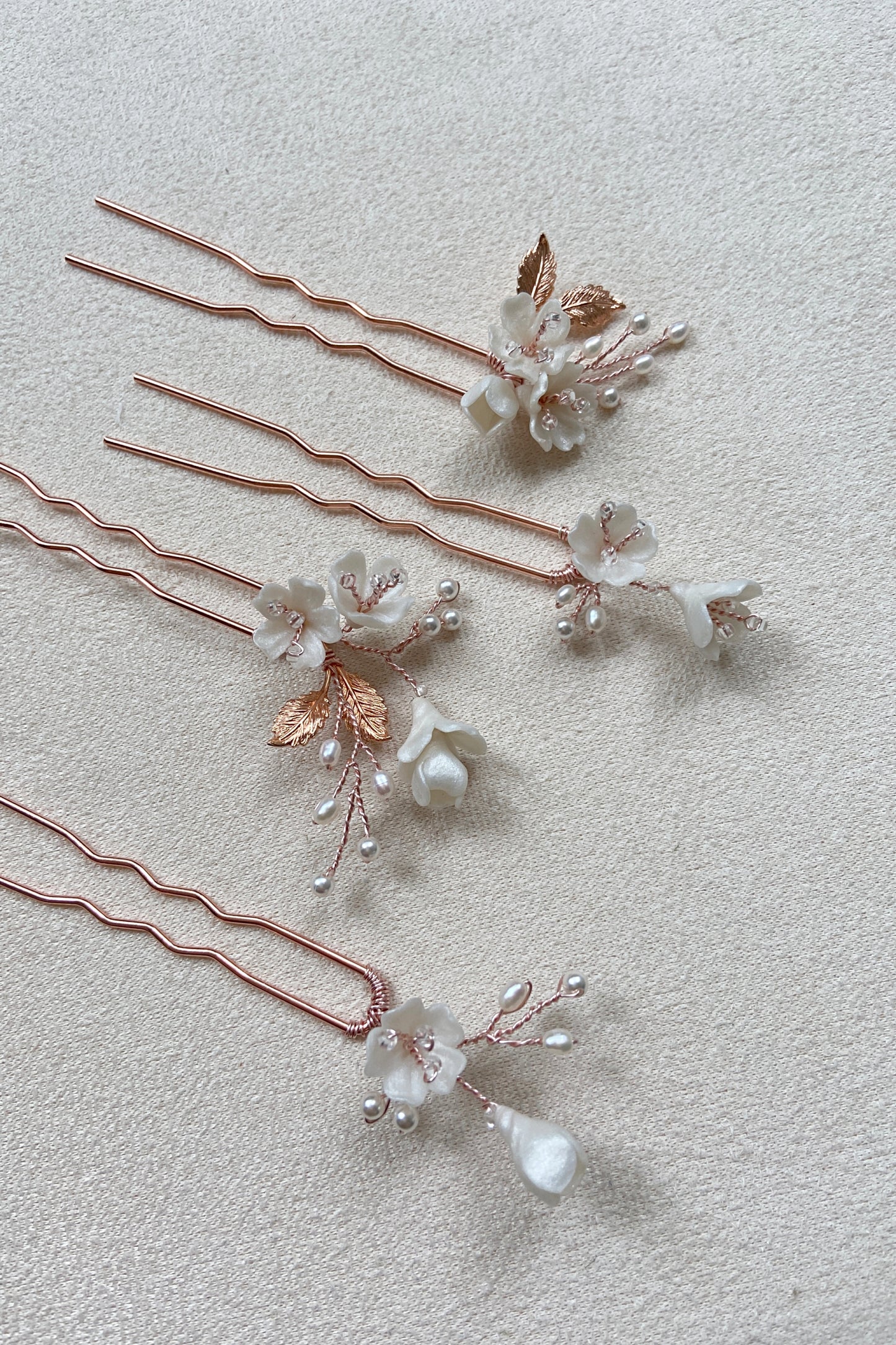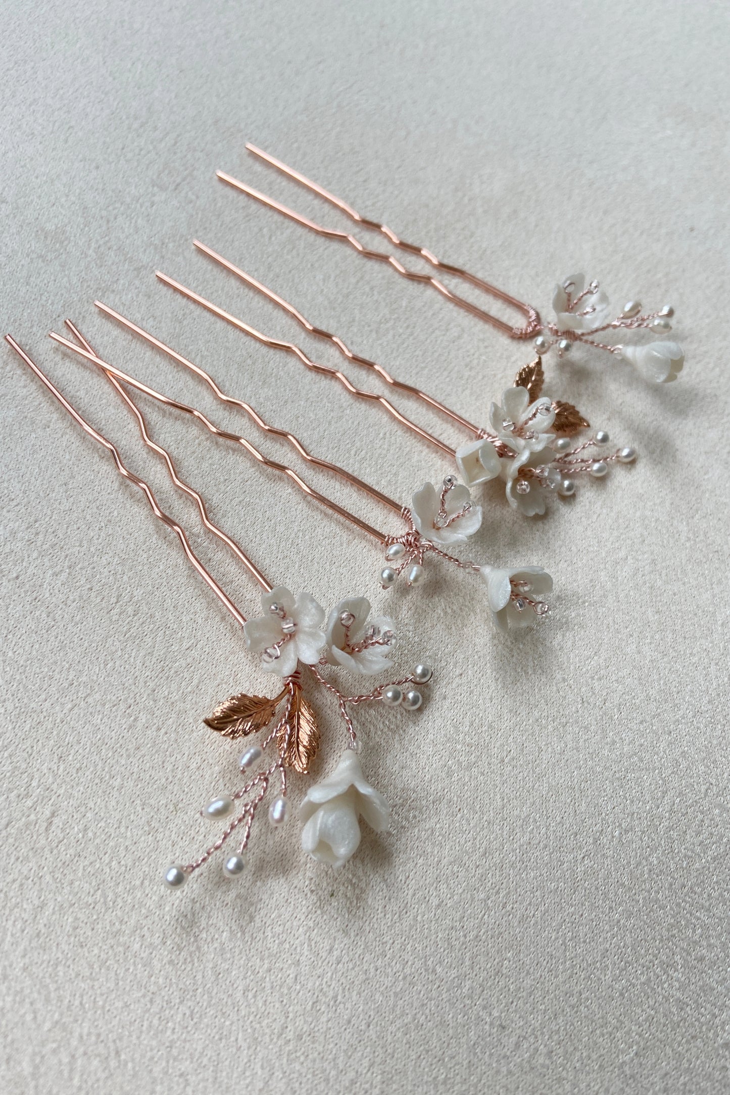 The prettiest feminine set of 4 delicate wedding hair pins. They feature hand sculpted flowers, small leaves and sprigs of freshwater pearls, all hand wired and attached to hair pins.