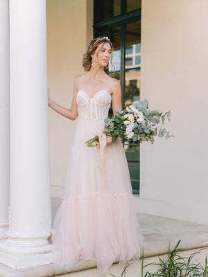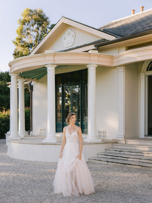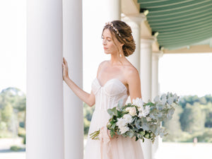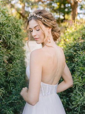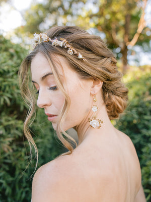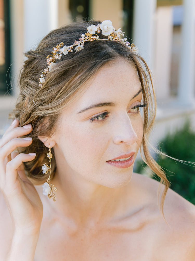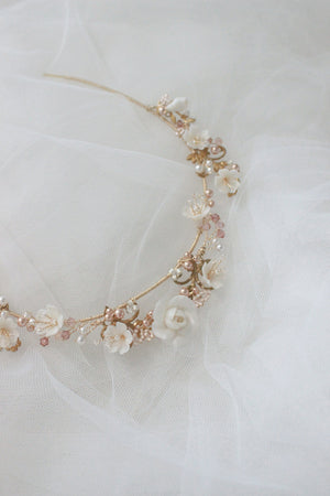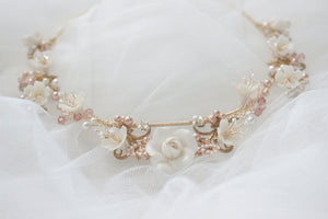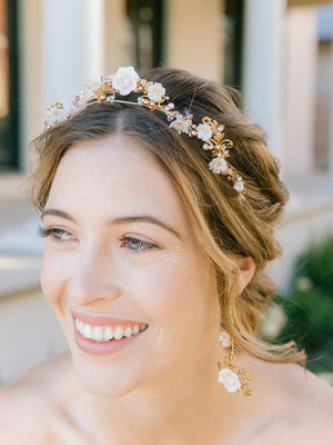 Designed for the modern and romantic bride, the Adeline crown is the definition of bridal luxury. The fine details feature an array of blooming flowers weaving along a fine metal headband and surrounded by hues of blush and gold to create the most charming piece.