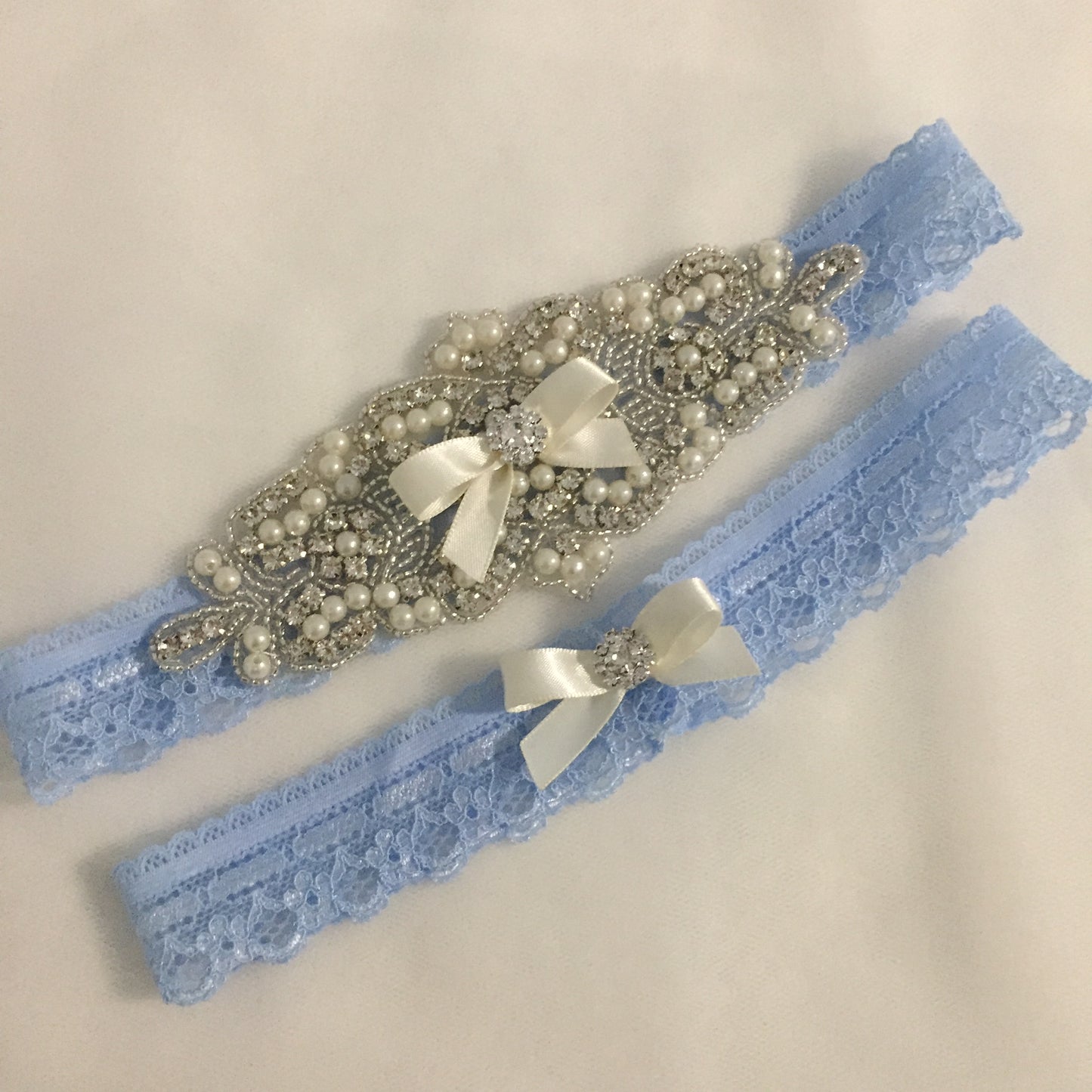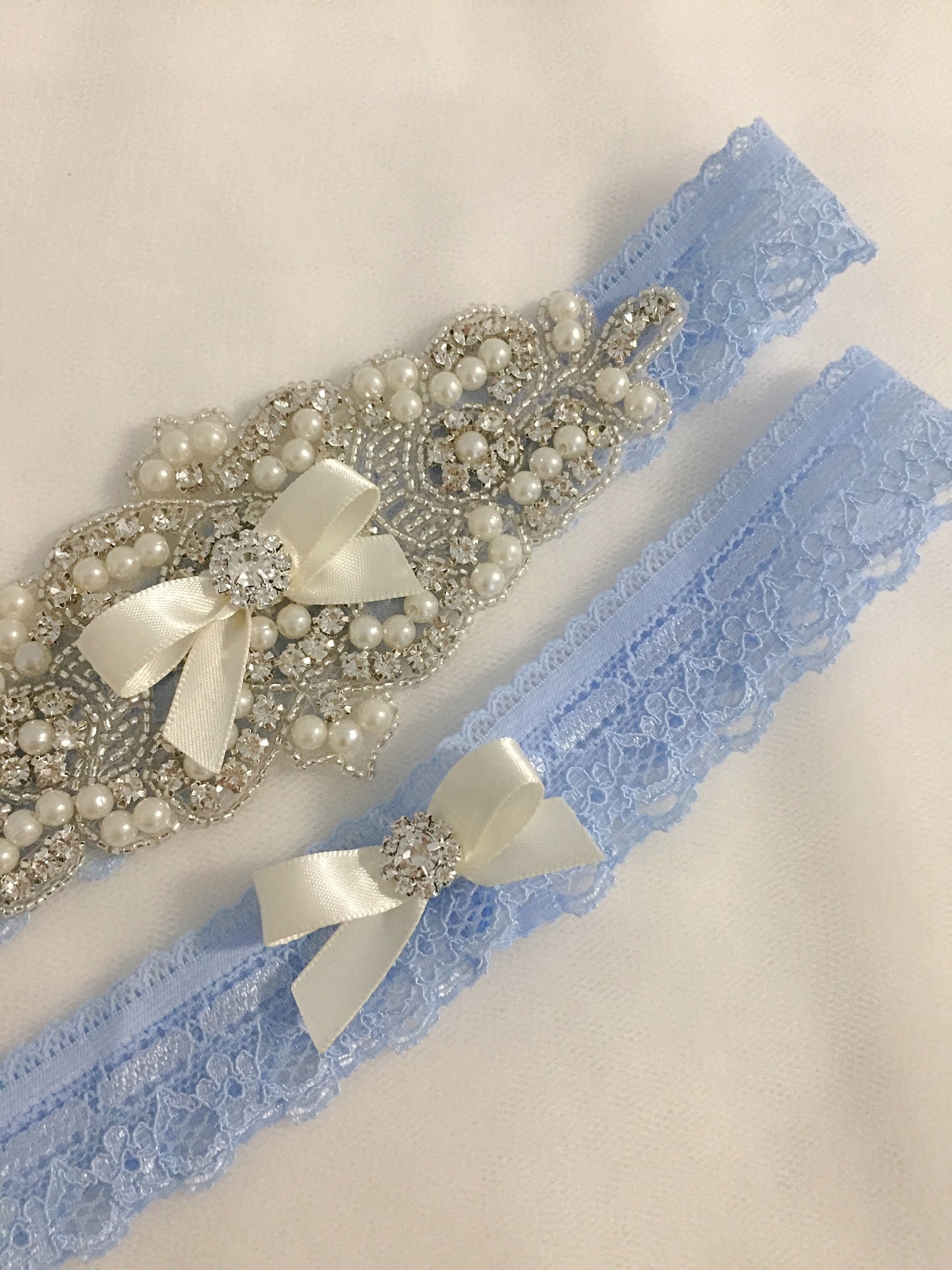 ELISABETH II | Blue Lace Wedding Garters with Crystals and Pearls - Something Blue Bridal