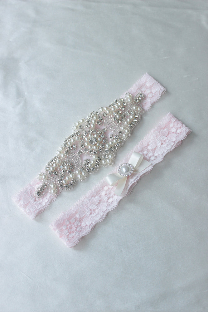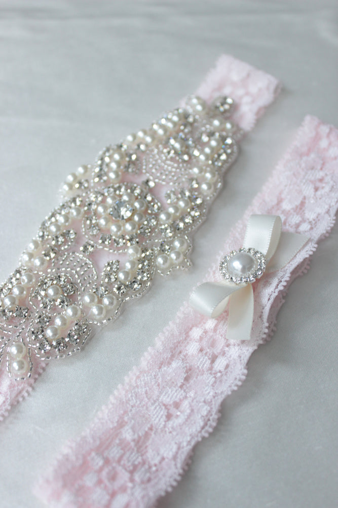 ELISABETH | Wedding Garter Set with Crystals and Pearls - Light Pink - Barbie pink